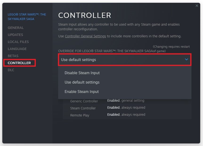 In the Controller tab of the game’s properties, ensure the Override for LEGO Star Wars option is set to Use default settings.