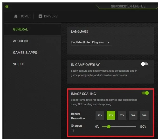 If the problem is related to your system performance, you might need to lower your in-game graphics settings. If you’re using an NVIDIA graphics card, I suggest enabling NVIDIA Image Scaling, which will greatly increase your performance. To do so, you should use the GeForce Experience application. In the Drivers tab, ensure that the most recent GPU driver is installed.