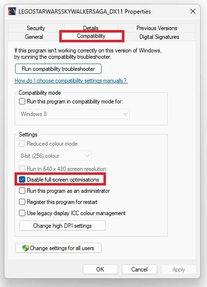 Make sure that you’re in the Compatibility tab and select Disable Fullscreen Optimizations and apply your changes.