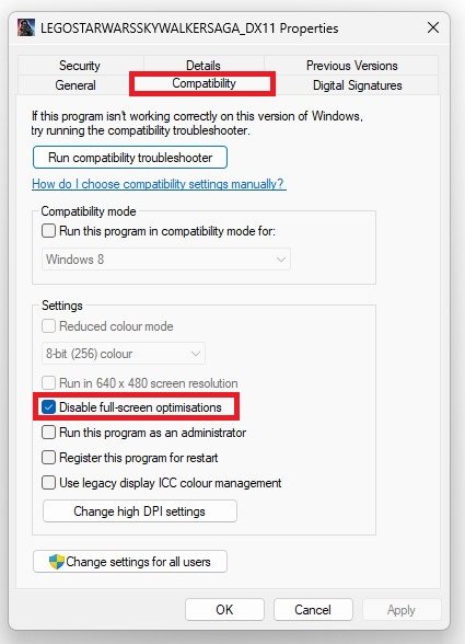 Ensure you’re in the Compatibility tab and select Disable Fullscreen Optimizations and apply your changes.