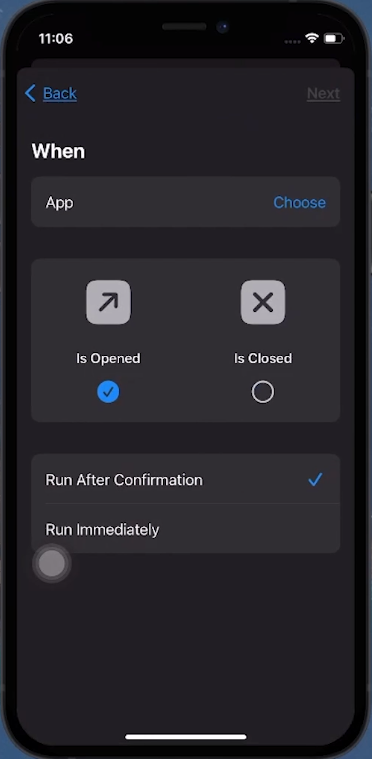 Create New Automation: Tap on 'New Automation', then search for 'App' in the search bar.