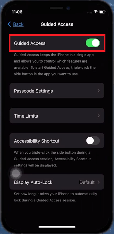 Enable the Feature: Tap on 'Guided Access' and switch it on. For added security, you'll also need to set a passcode.