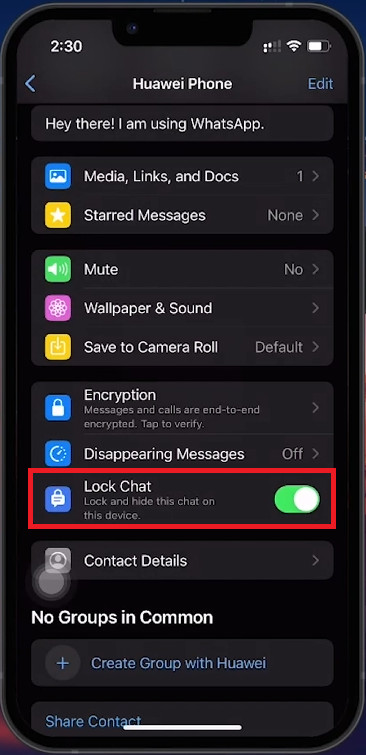 Open WhatsApp, select the chat you want to lock, tap the contact's name to open their info page, and scroll down to toggle on "Lock Chat." Face ID verification will then be required to lock the chat.