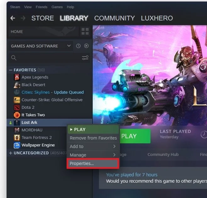 Ensure the Lost Ark game files are complete and up to date. Open up your Steam library. Right-click Lost Ark and select Properties.