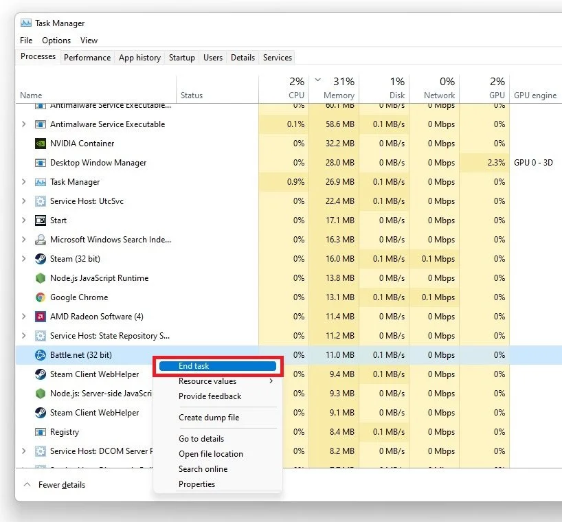 Here, in the Processes tab, make sure to end the processes which could show an overlay, such as Discord or other applications running on your system. You should also prevent application from running which could change your game files, such as CCleaner or your anti-virus application.