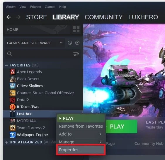 Ensure that your game files are complete and current. Open up your Steam library. Right-click Lost Ark and select Properties.