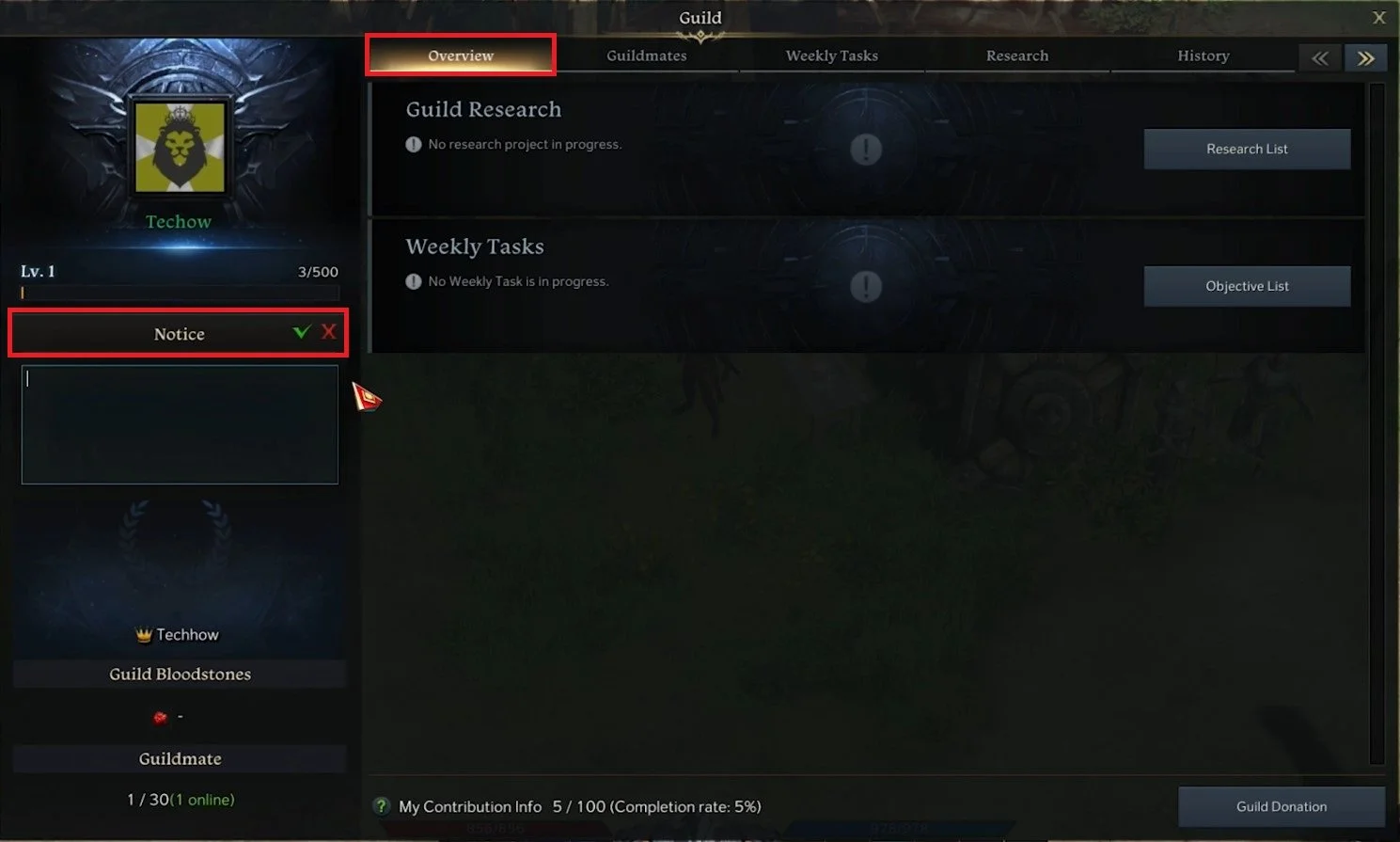 On the top left, you can preview the guild flag and level. Below, you have the option to edit your guild notice.