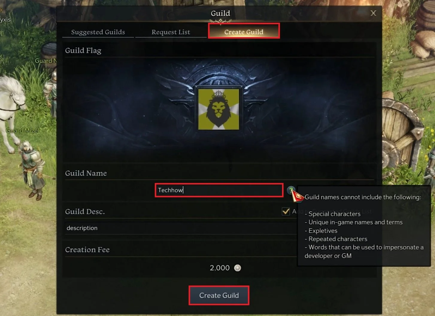 In the Create Guild section, make sure to come up with a guild name, which has to follow some rules, such as no special or repeated characters. You also have the option to be shown in the Suggested Guild list or not. Enter a guild description, and then pay a Creation Fee of 2000 silver. After paying the fee, your guild will be created.