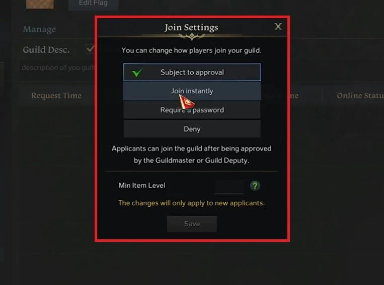 Below, you can change your Join Settings from Subject to approval to Join Instantly, Require a Password or simply Deny any join request automatically. You can also change the minimum item level requirement to join the guild, which will apply to new applicants. When selecting Disband Guild, you must confirm your action, and then you can not join or create another guild for at least 3 minutes.