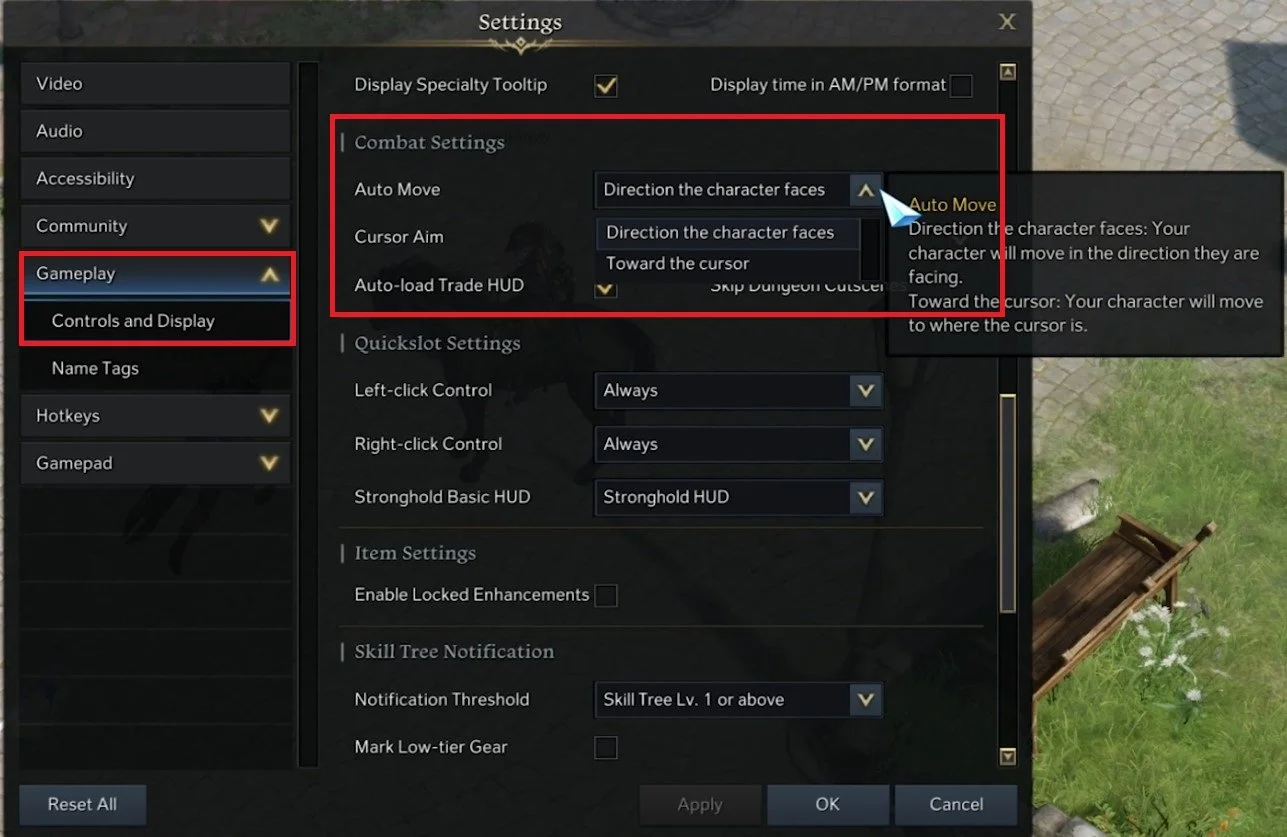 In the Gameplay tab, scroll down to your Combat Settings under Controls and Display. Change the Auto Move option from Direction the character faces to Toward the cursor, which means that your character will navigate to the location of your cursor. Toggle the Cursor Aim option on or off, which is basically aim assist for your character. When this option is enabled, your character will attack an enemy when they are in the approximate area of your cursor.