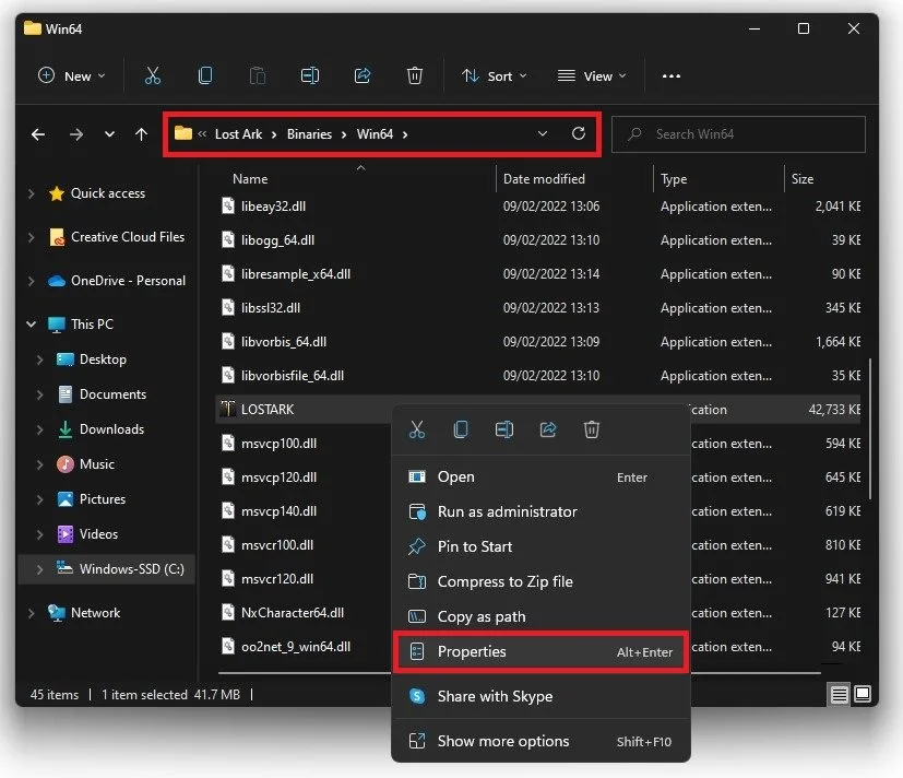 When this is done, open up your File Explorer and navigate to the drive on which you saved the game on: Program Files > Steam > steamapps > common > Lost Ark > Binaries > Win64 and here right-click the LOSTARK.exe application and go to its Properties.