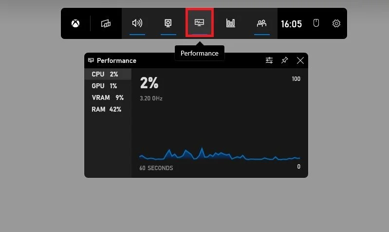 Back in Lost Ark, use the shortcut, and then you can preview some of these panels that are here by default. In your top menu, make sure to enable the Performance window. This window will have a transparent background when pinned, and you can preview your utilization while playing Lost Ark.
