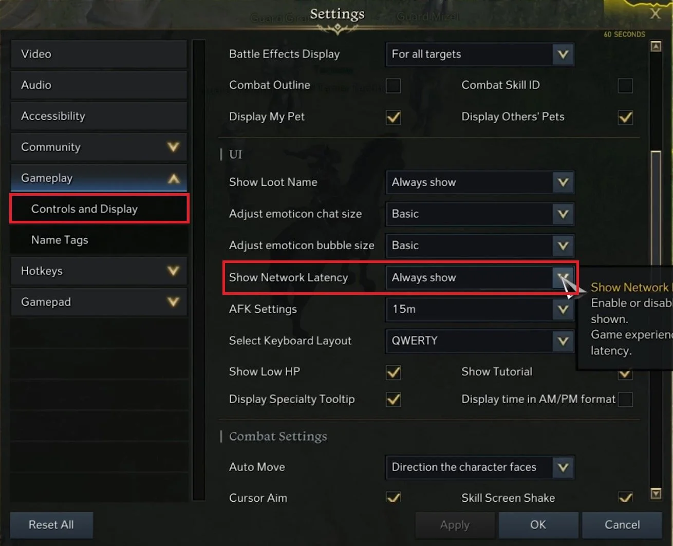 If you want to see the latency or ping to your current server, then navigate to your in-game settings. In the Gameplay tab, under Controls and Display, make sure to scroll down to the UI section and change the Show Network Latency setting. When setting this option to Always show, you can preview the ping or latency to the server you are playing on.