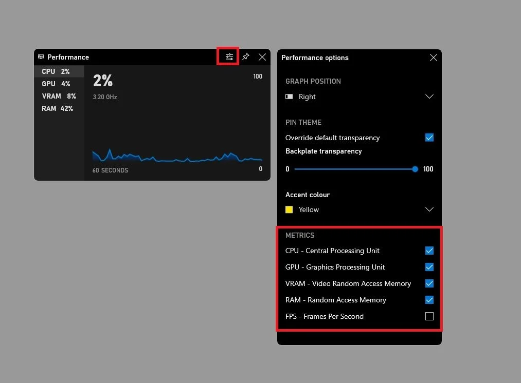 Before pinning the window and selecting the best location, open up your performance Preferences. Choose the best graph position; we like to use a transparency of 100%, and below, enable or disable some of the metrics you wish to see. You can also change the overlay color. Make sure to use a bright color to see it while in-game.