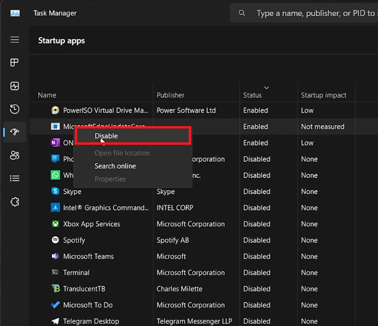 Right-click on each app you don’t need immediately at startup and select 'Disable'.