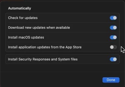 Here, click on Advanced or on the “i” icon. Make sure that all these options are toggled on, besides the Install application updates from the App Store, which you can leave toggle off. You can then test if you’re able to install the latest update.