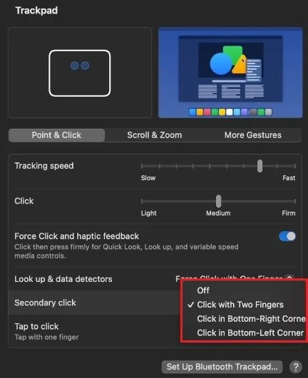 In the Trackpad section of your settings, make sure that you’re in the Point & Click tab and slightly decrease and increase your tracking speed as well as the click speed. Below, temporarily disable the Force Click and haptic feedback option. This can also fix the problem when your trackpad is not responding or not allowing you to left and right-click.