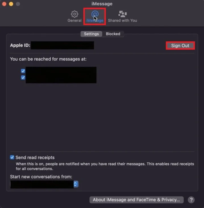 In the iMessage tab, you can verify if the correct Apple ID is signed in. If this is not the case, sign out of the current account and log back into the correct Apple ID account.