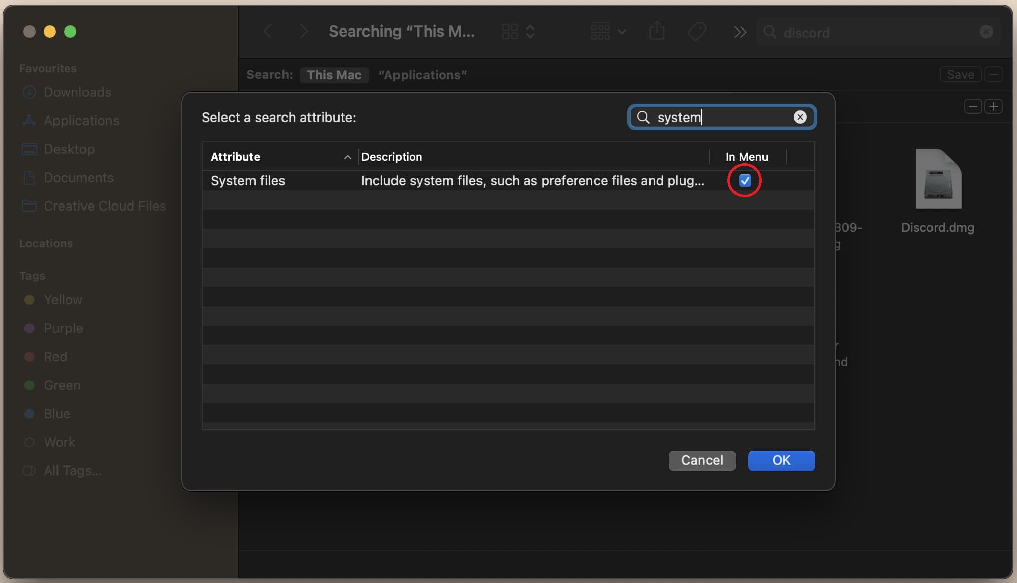 To find more application files, click on the plus icon on the top right of your finder window. Ensure that the first option is set to Other, allowing you to check System Files and add it to the previous menu.