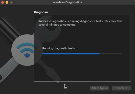 If the WiFi problem persists, open your Spotlight search and look up Wireless Diagnostics. The wireless diagnostics will allow you to test changes and apply some network settings to fix any potential network issues. Click on Continue, and wait a moment for the diagnostic result. You might be prompted to restart your router and the connection process.