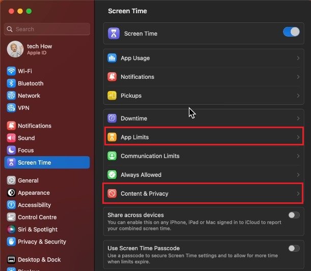 While still in your settings, navigate to the Screen Time section. Here, you should first make sure that there is no limit to using a browser on your Mac by disabling any App Limits on your Mac. Under Content & Privacy, proceed to disable restrictions to see if this helps with your network connection.