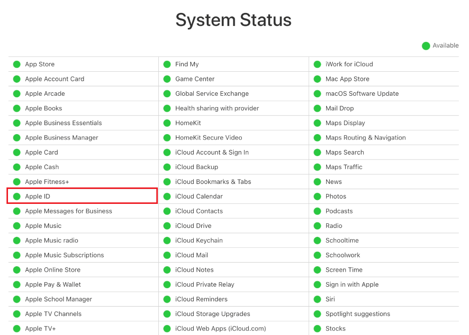 While here, navigate to apple.com/support/systemstatus. All links to websites will be in my extensive guide link in the description below. Ensure that the Apple ID servers are operational and not undergoing maintenance.