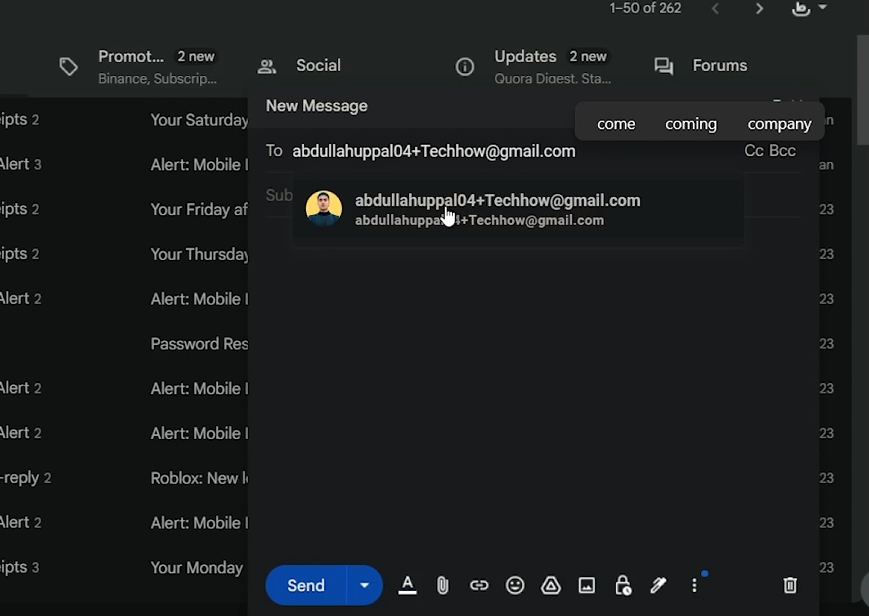 Create an Alias: Compose a new email. In the 'To' field, enter your primary Gmail address with a '+' sign and a keyword before the '@' symbol. Example: 'example+work@gmail.com' for work emails if your primary email is 'example@gmail.com'.