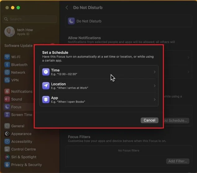 You can first set a schedule, where at the same time of day or location or when a specific app is launched, you can prevent notifications from disturbing you. Add a filter for apps that still have permission to disturb you while the focus mode is enabled.
