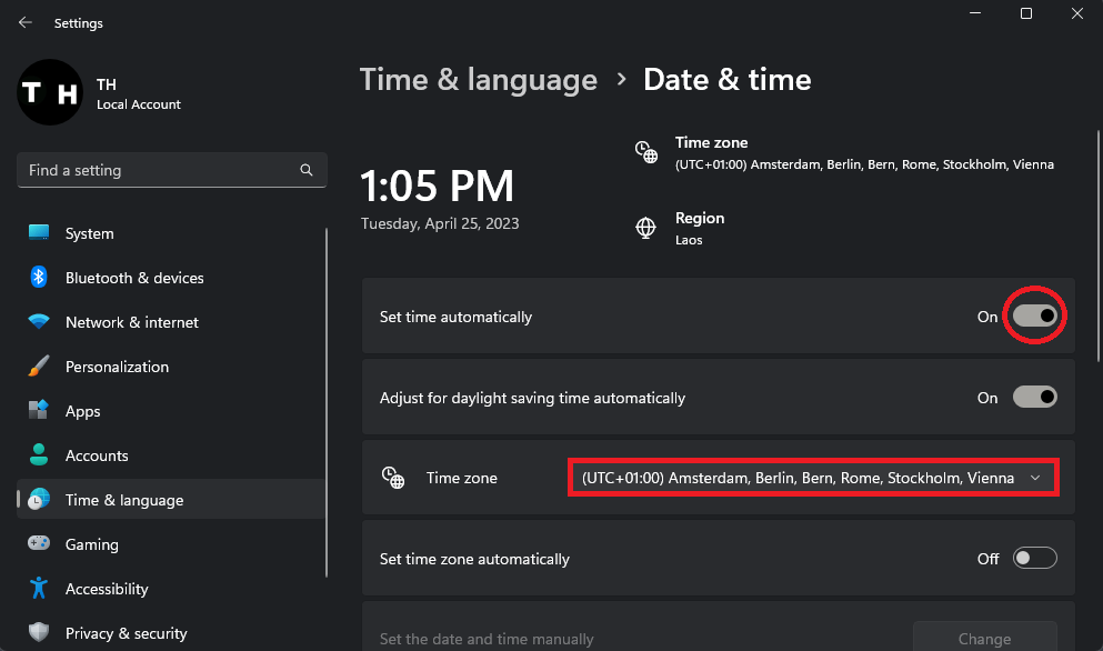 In your Windows settings, go to the "Time & Language" section, select "Date & Time", and ensure the "Set time automatically" option is enabled. Set the correct time zone for your country or region, and disable your VPN connection if active.