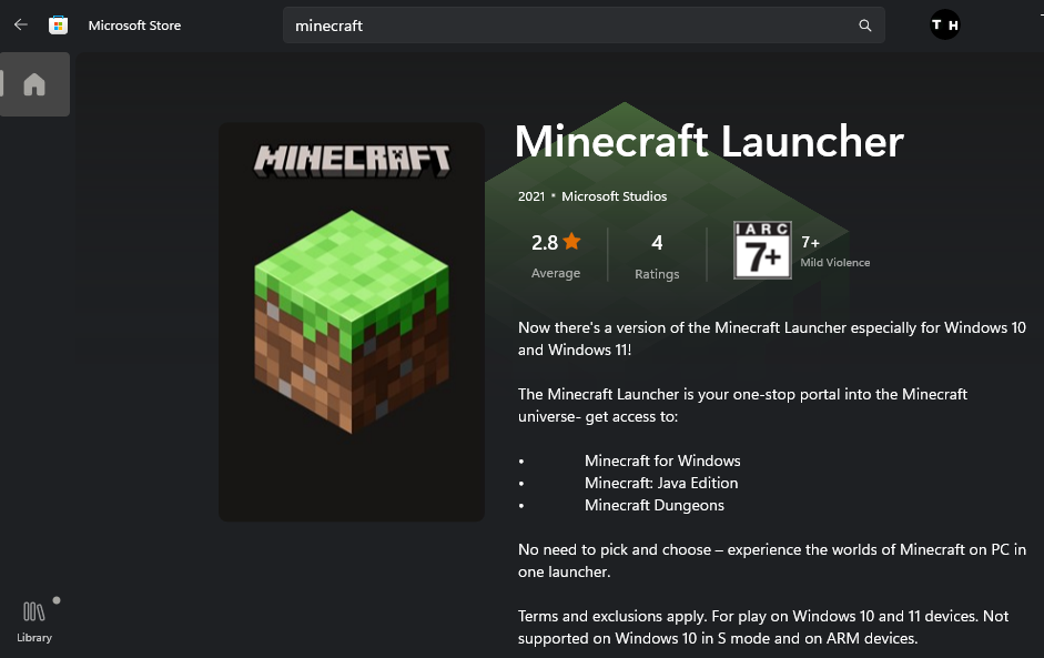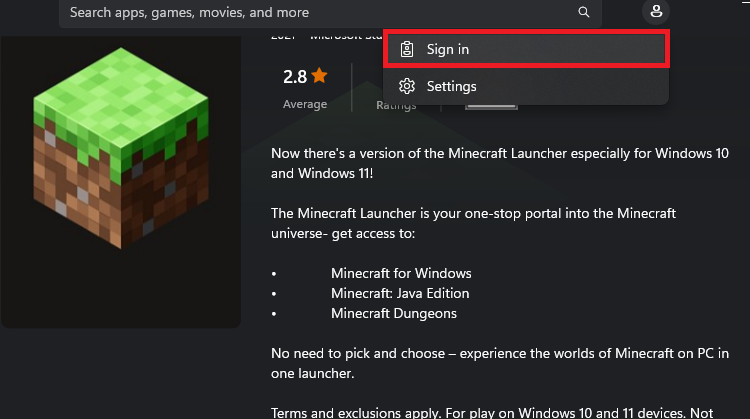 Close both Minecraft and the Minecraft launcher. Next, open the Microsoft Store application on your device. Search for Minecraft and attempt to launch either the Minecraft Launcher or the game itself directly from the store. In case there's an available update for the game, go ahead and download it before proceeding to start the game. Make sure you're logged into your Microsoft account during this process.