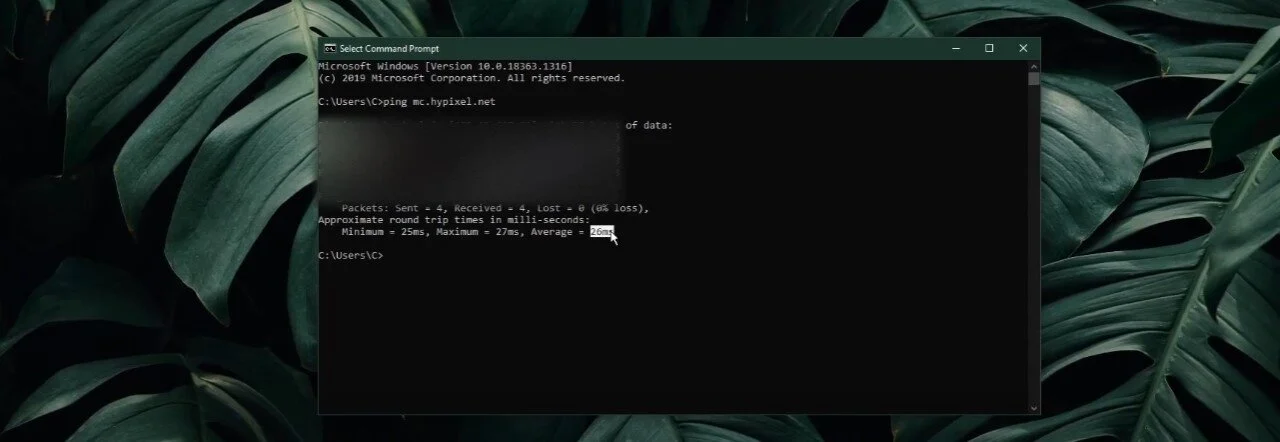The easiest way to check your ping is to use your command prompt. Search for CMD in your taskbar search to open up your command prompt. Enter the command ping followed by the server’s IP. For example, ping mc.hypixel.net. After using the command, you will see your average, maximum, and minimum round trip time, which is how long it takes for information to get sent and received back from the server. This will depend not only on your overall network connection but also your current location and server usage.