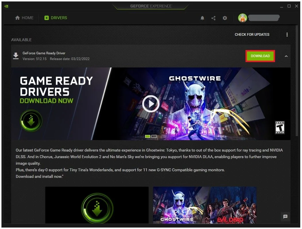 Ensure your graphics driver is up to date. I recommend using the GeForce Experience application to update your NVIDIA GPU driver. In the Drivers tab, click on Download. This will take a minute to download and automatically install the latest graphics driver.