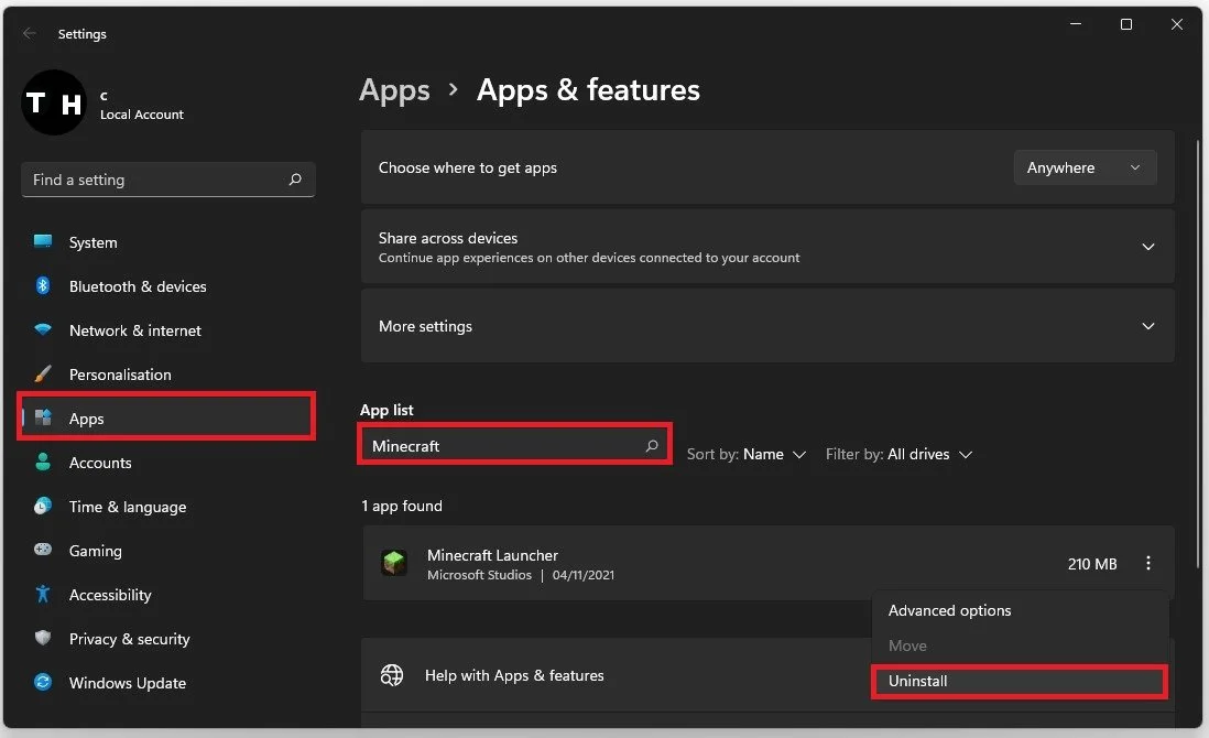 This error is usually caused by having more than one Minecraft launcher installed on your PC or your sign-in credentials are incorrect. Search for Apps in your start menu search to open your Apps & Features system settings window. Filter your search by all drives and then search for Minecraft. Make sure to uninstall any old Minecraft launcher installed on your PC.