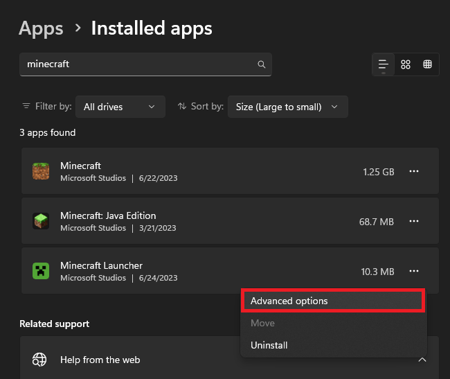 In instances where there are no updates available, you can turn to your Windows settings to attempt a repair and reset operation. Go to 'Apps', then 'Installed Apps'. As it loads the comprehensive list of all installed applications on your PC, use the search function to find 'Minecraft'. You'll see a three-dotted 'burger' menu icon next to the Minecraft launcher - click this and opt for 'Advanced Options'.