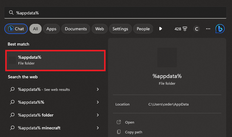 Before you proceed with the reinstallation, remember to safeguard your AppData Minecraft folder. To locate this, type %AppData% into your start menu search and press enter to bring up the file explorer.