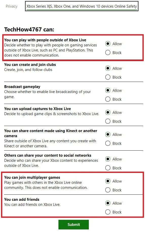 Lastly, in your Xbox and Windows Devices Online Safety tab, you should allow your account to access most of these options. These include: You can play with people outside of Xbox Live, You can join multiplayer games, and You can add friends.