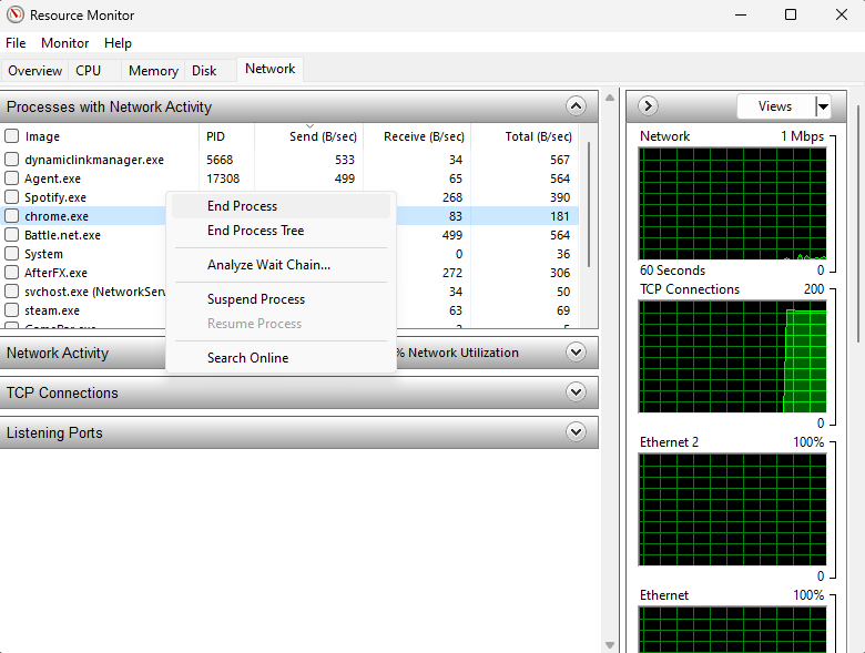 In the Network tab, open the Processes with network activity, and after a few seconds, you will see every process using your network connection. This might be your browser running in the background, Steam, or a download bottlenecking your connection. I suggest you only end the processes you know won't break your operating system.