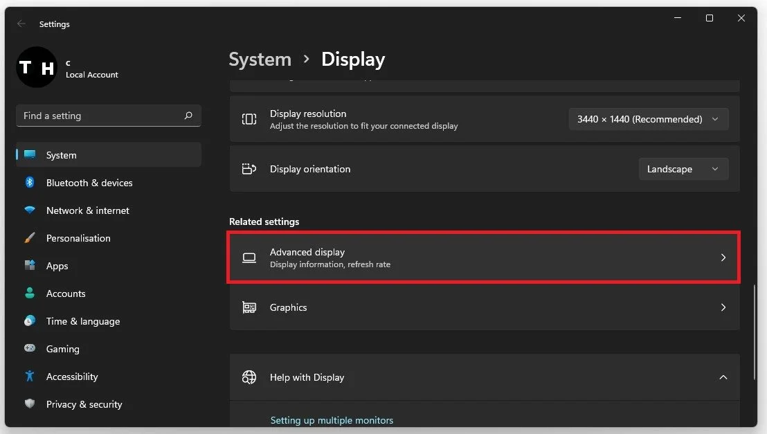 Ensure the correct display is selected, scroll down, and click on Advanced Display.