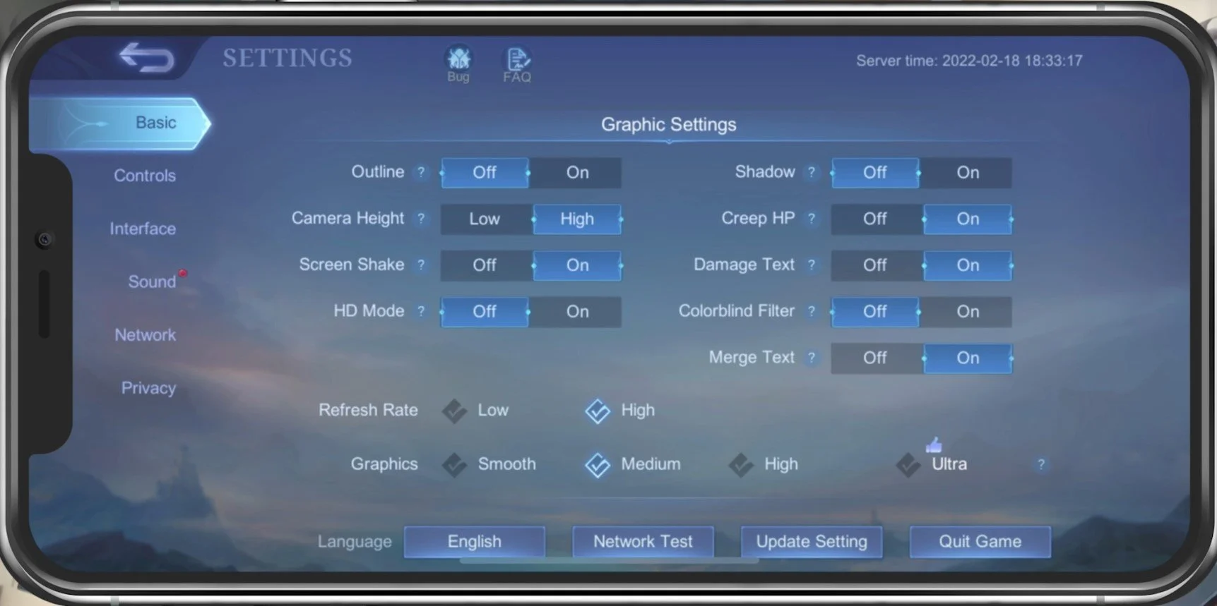 In your Mobile Legends Basic settings, disable the HD Mode, which will increase your overall performance and fix lag as high-definition textures will not be used while in-game. Disable Shadows to keep a better frame rate. Below, change your refresh rate setting to High. This will make the game look smoother if your device supports high refresh rates. The Graphics setting should be set according to your device's performance. Low-end devices should set this to Smooth.