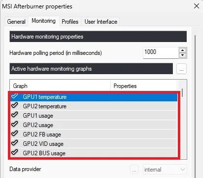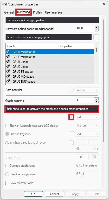 After applying your changes, close this window. Under Active hardware monitoring graphs, preview a list of possible values or graphs the application can show you. This could be temperature and usage for each graphics card, CPU voltage, etc. Proceed to uncheck the graphs you don’t want to track. After applying your changes, you should be able to see your on-screen display the next time you launch a fullscreen application on your PC.