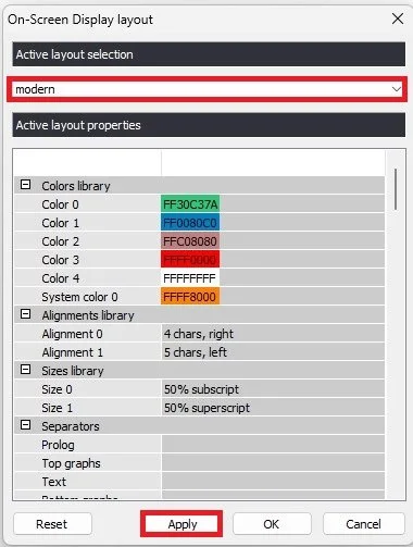Next, click on the burger menu icon in your Monitoring settings to open up your On-Screen Display layout settings. You can first select a preset for your On-Screen Display. Next, you can manually change the color, text size, and all other options below.