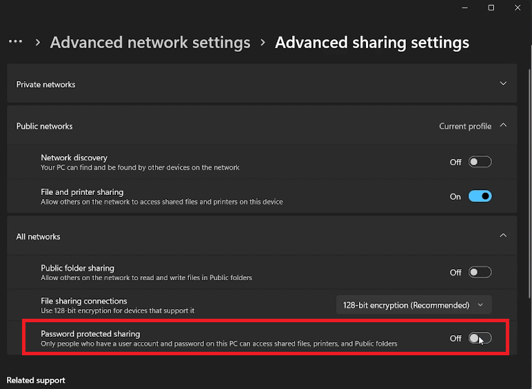 Altering Network Preferences: Navigate to the 'All Networks' tab and decisively disable the 'Password Protected Sharing' option. This crucial step can eradicate the persisting “Network Credentials” error on your Windows PC, ensuring smoother operations moving forward.