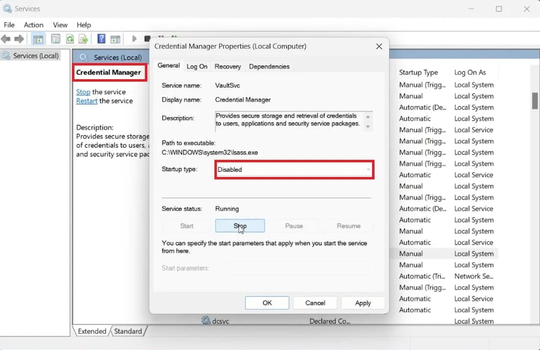 Modifying Service Properties: Double-click on the 'Credential Manager' service to open its properties. Here, change the 'Startup Type' to 'Disabled' and cease its current operation by clicking the 'Stop' button.