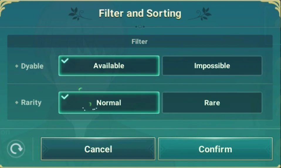 When selecting the arrow icon at the bottom of the list of items, you can select how to filter and sort your outfits, decoration items, and so on.