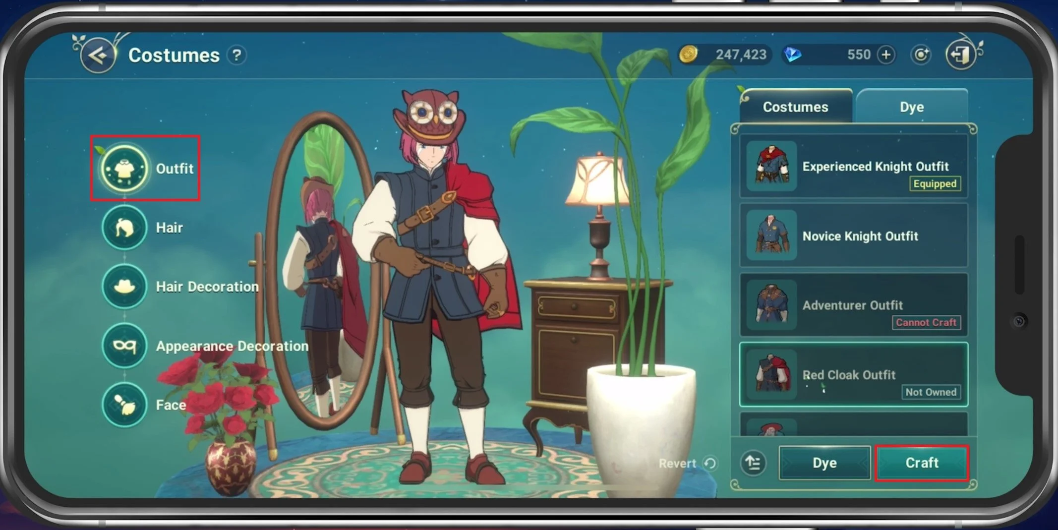 You can preview your character and pick from a list of unlocked or crafted outfits. If you wish to unlock a specific outfit, tap on Craft after selecting it.