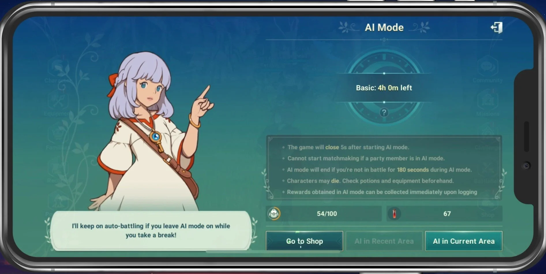 This battle mode allows you to quit the game completely on your PC or mobile device while leaving your character in battle until you return. By default, you’re only allowed a total of 5 hours in AI mode, after that your character will automatically stop and wait for your return. When purchasing the Daily Adventure pack, then you’ll be allowed 6 additional hours of AI mode.