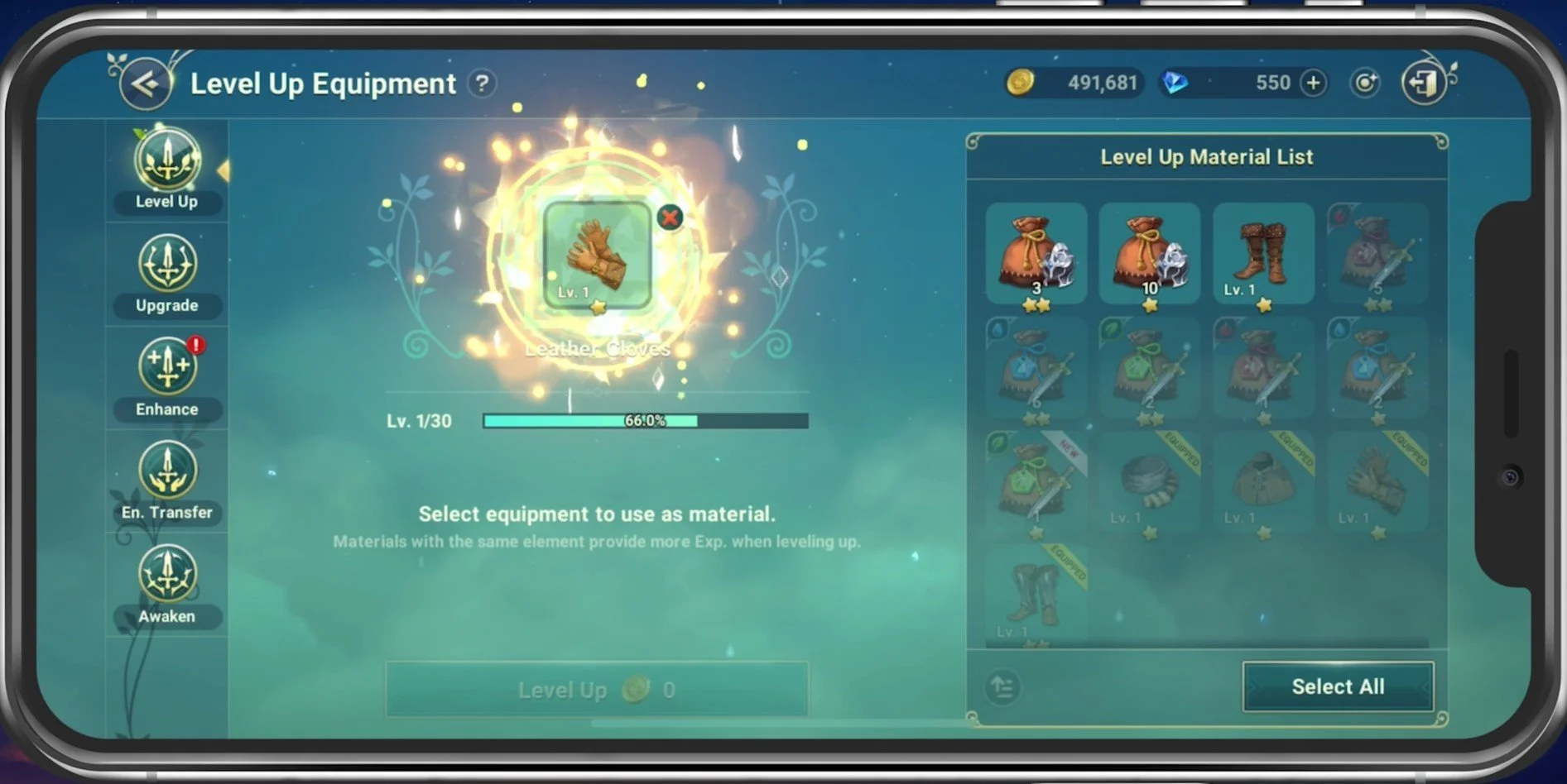 You can select equipment to Level Up on the right-hand side. This can be one of your inventory's offensive, defensive or other equipment items. You will have to pay a price in gold as well as Varnish.