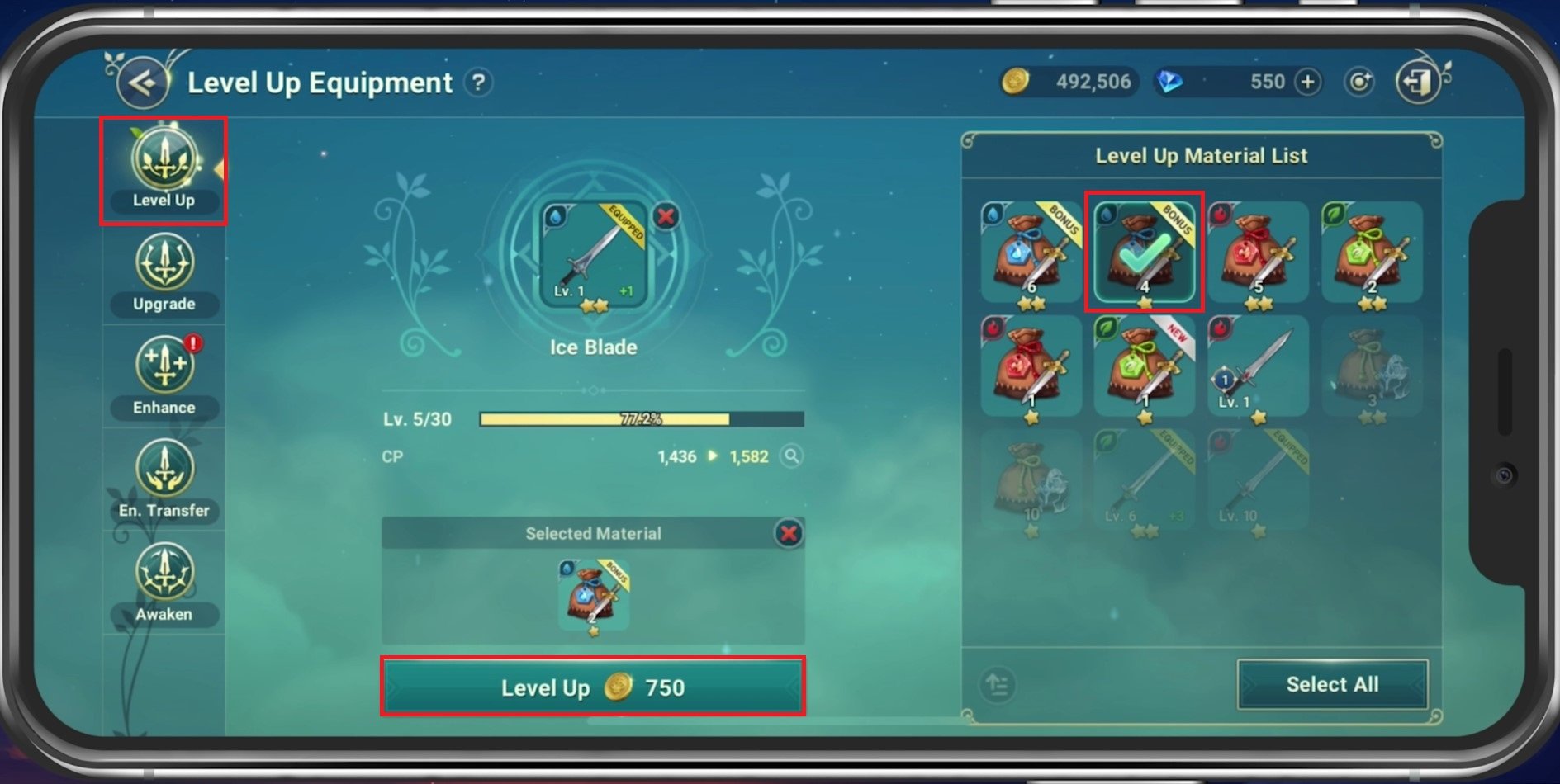 In the Upgrade section, you can select the equipment to upgrade. Items which can’t be upgraded will not be selectable. Equipment level 30 or higher can not be upgraded.