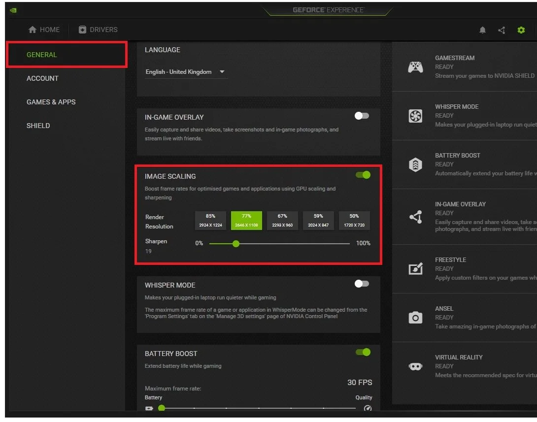 Reopen your GeForce Experience application. Navigate to your settings when clicking on this gear icon, and in the General tab, you will see the Image Scaling settings. Enable Image Scaling from here, and then you can choose the best option according to your native monitor resolution and the resolution you wish to game in. While in your GeForce settings, it’s suggested to disable the in-game overlay and Reward notifications to get the best performance while in-game.