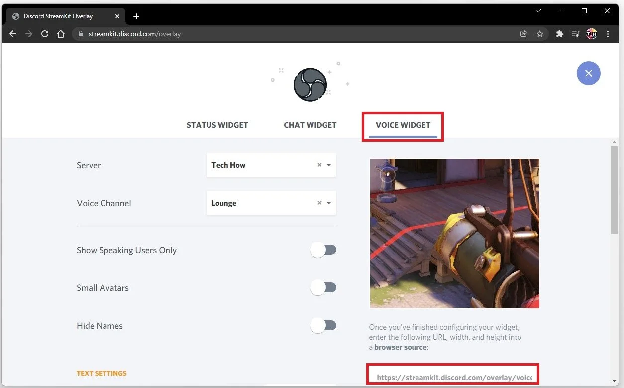Create your widget for OBS, such as a Status Widget, Chat Widget or Voice Widget. In this example, we will create a Voice Widget. Select the server on which you have permission and the Voice Channel. Below, make sure to change the settings to your liking.